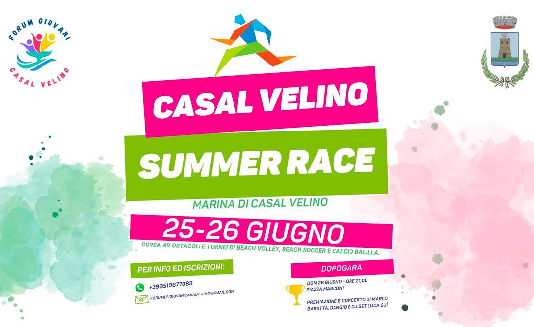 Il Forum dei Giovani di Casal Velino organizza 25-26 giugno CASAL VELINO SUMMER RACE: torneo di beach volley, beach soccer, calcio balilla e un’avvincente corsa ad ostacoli.